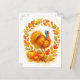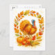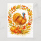Celebrate the beauty of the harvest season with this elegant Thanksgiving postcard featuring a watercolor turkey surrounded by a wreath of autumn leaves, pumpkins, apples, and corn.