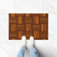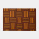 This doormat has a mid-century modern design that looks like a weave with orange and brown lines on a field of darker brown.