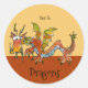 A whimsical cartoon dragon illustration on a round sticker is in browns, golds, orange, with a pale blue underside. You can edit text to create your own personalised gift. Need help, email lilly@lillyarts.com