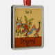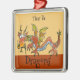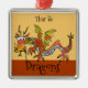 A whimsical cartoon dragon illustration on this square metal hanging ornament is in browns, golds, orange, with a pale blue underside. You can edit text to create your own personalised gift. Need help, email lilly@lillyarts.com