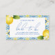 Add a touch of Italian charm to your special event with this "That's Amore" Italian Lemon Blue Tile Enclosure Card. Featuring vibrant yellow lemons, intricate blue Mediterranean tiles, and elegant script, this card is perfect for weddings, bridal showers, or destination celebrations. Customise it with essential details like RSVP information, accommodations, or a heartfelt message for your guests. Effortlessly stylish and timeless, this design captures the romance and warmth of Italy, making it a beautiful keepsake.
