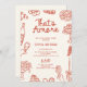 The invitation features a quirky handwritten font, adding a personal and playful touch that invites your guests to partake in the celebration. Surrounding the edges are red hand-drawn illustrations of iconic Italian foods — think delicious pizzas, creamy pastas, and fresh lemons — capturing the heart of Italy's culinary delights and creating a festive atmosphere.