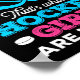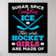Hockey theme poster for the hockey girl with hockey puck and sticks with text of off white, pink, and blue that reads Sugar, Spice and Everything Ice That's What Hockey Girls Are Made Of.