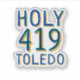 The design celebrates the unique cultural identity of the "Glass City" by pairing two of its most recognizable symbols. "Holy Toledo"—an expression of surprise that became synonymous with the city’s impressive number of churches and its vibrant history—is set in a bold, modern typeface alongside the "419." This area code has evolved into a badge of honor for residents of Northwest Ohio, representing the grit, ingenuity, and community spirit of the region.