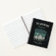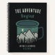 This personalized adventure-themed notebook features a modern, outdoorsy design perfect for nature lovers, travelers, and newlyweds starting a new chapter together. The cover showcases a rustic illustration of a mountain landscape and forest inside a camp-style mug, set against a bold black background for a striking, contemporary look. “The Adventure Begins” is displayed in a charming hand-lettered style, with customizable names and date beneath, making it an ideal gift for weddings, engagements, anniversaries, or anyone embarking on a new journey. With lined interior pages and durable spiral binding, this notebook is both stylish and practical for journaling, planning, or capturing memories on the go.