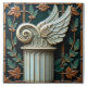 A square relief sculpture featuring a classical column adorned with wings, set against a dark green background with botanical elements. The column, positioned in the lower centre, is a pale, weathered white with vertical fluting and decorative moulding at the base and capital. Atop the column sits a stylised capital with a prominent volute, from which a pair of stylised wings extend upwards and slightly to the right.
