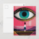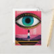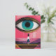 Colourful surreal art of a giant eye in the pink sky looking down on a woman looking out at the landscape AI generated art