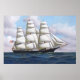 This is a remastered and enhanced reproduction of a clipper ship produced from a copy of the original oil painting inspired by Antonio Jacobsen, a prolific late 1800s and early 1900s nautical art painter. We expanded the image and retouched it using AI tools and Photoshop to restore details and vibrancy. The artwork is titled The American Clipper Flying Cloud At Full Sail. Donald McKay’s East Boston–built extreme clipper, the Flying Cloud, shattered the New York to San Francisco sea route in 89 days, 8 hours, sailing under Captain Josiah Creesy with his wife, Eleanor Creesy, as the navigator at the charts. The ship sailed to California as part of the Gold Rush era. Later, she was bound for Australia and the timber trade. Eventually, she met her fate when she ran aground on June 19, 1874, on the Beacon Island Bar, Saint John, New Brunswick. This artwork is in the classic style of Antonio Jacobsen, the prolific chronicler of ships, who captured hull lines, rigging, and sea state with unmatched accuracy.