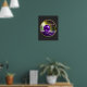 This striking 16x20 poster design features beautiful AI generated fantasy digital art of a magical / mystical amethyst crystal orb floating in a forest. Round graphic with gold border on black background.