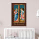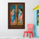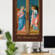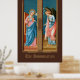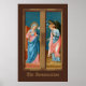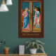 “℣. The Angel of the Lord declared unto Mary,  ℟. And she conceived of the Holy Spirit.” Thus, begins the Angelus the Church’s thrice-daily prayer to the Blessed Virgin Mary (BVM) that commemorates the Incarnation at the Annunciation. + The Annunciation was an immensely popular subject in the art of the Middle Ages and the Renaissance.  As a two-person composition, the subject lent itself to use on the outer leaves of triptychs: the angel on one leaf; Mary, on the other.  A triptych is an artwork—most often a panel painting—that is comprised of three parts hinged together in such a way that it can be displayed open or folded shut.  +  Here, Filippo Lippi (1406-1469) has painted the Annunciation in tempera on wood in warm pinks, salmons, and reds and in both brilliant and dark blues.  Both figures stand in their narrow respective spaces, the Archangel Gabriel bowing slightly to the gentle and sweetly featured Maiden Mary.   +  Saints_Aplenty likes a dark brown background for this image.  A dark brown background gives viewers the impression that they are onlookers observing the scene through a window.  But, as per usual, we have provided a Colour Palette postcard for other suggested hues.  +  Feast of the Annunciation:  March 25; Feast of St. Gabriel the Archangel:  September 29   +   Image Credit (M 038):  Antique image of The Annunciation by Filippo Lippi (1406-1469) from a late 19th-early 20th-century postcard in chromolithography, originally published by E. Sborgi, Florence, Italy, from the designer’s private collection of religious ephemera.  The original panels from a polyptych of unknown origin are in the Filippo and Filippino Room of the Uffizi Gallery in Florence.  The Annunciation forms the upper halves of the two leaves while SS. Anthony Abbott and John the Baptist appear on the lower left and lower right, respectively.