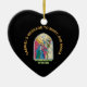 This design features a stained-glass-style illustration of The Annunciation, where the Angel Gabriel delivers his message to the Virgin Mary, with the Holy Spirit symbolized by a dove above them. The illustration is crowned by the curved text "GABRIEL'S MESSAGE TO MARY: AVE MARIA" and the title "THE ANNUNCIATION OF THE LORD" at the bottom, all set against a contrasting black background.