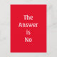 The Answer is No typography design. White lettering on a red background. Send this message to anyone to answer their question! Put it on your desk and hold it up when your boss speaks to you! Easily personalise this card by editing the template text to a message of your own choice.