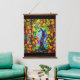 Colourful wood topped wall tapestry created with AI software features a surreal stained glass apple tree with green and gold leaves, and red apples, that create a frame as well. Added black top and bottom borders.