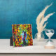 Colourful tabletop art created with AI software features a surreal stained glass apple tree with green and gold leaves, and red apples, that create a frame as well.