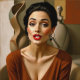 The Art Between Us – Colourful Portrait. Is the woman the subject, or is she simply another piece in the gallery of forms? This portrait blurs the line between living beauty and sculptural artistry. The curving, abstract works in the background echo her figure, creating a visual dialogue about what we value: the created, the creator, or the muse herself. This piece is in a rich, warm colour palette dominated by deep browns, golds, and neutral hues.