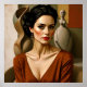 The Art Between Us – Colourful Portrait. Is the woman the subject, or is she simply another piece in the gallery of forms? This portrait blurs the line between living beauty and sculptural artistry. The curving, abstract works in the background echo her figure, creating a visual dialogue about what we value: the created, the creator, or the muse herself. This piece is in a rich, warm colour palette dominated by deep browns, golds, and neutral hues.