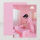 A woman dressed head-to-toe in soft pink meticulously wraps presents in a perfectly coordinated pink room. Her matching outfit, including gloves and a hat, adds a vintage flair, complementing the feminine, pastel aesthetic of the space. The carefully arranged gift boxes, all adorned with silky pink ribbons, create an atmosphere of elegance and precision. The scene evokes a sense of calm and order, with a focus on the beauty of simplicity and uniformity in colour and style.