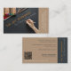 The Art Workshop Brown Artist Business Card shows an art activity on a black surface with art supplies. It has a clean typography, with a brown angled business name on centre and the business services list on front side. The business name at the back is on a black strip vertical position. Also, the business details are in a brown background plus the QR code. The entire concept is contemporary and playful makes it exciting for an artist business card.