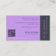The Art Workshop Purple Artist Business Card shows an art activity on a black surface with art supplies. It has a clean typography, with a purple angled business name on centre and the business services list on front side. The business name at the back is on a black strip vertical position. Also, the business details are in a purple background plus the QR code. The entire concept is contemporary and playful makes it exciting for an artist business card.