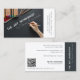 The Art Workshop White Artist Business Card shows an art activity on a black surface with art supplies. It has a clean typography, with a white angled business name on centre and the business services list on front side. The business name at the back is on a black strip vertical position. Also, the business details are in a white background plus the QR code. The entire concept is contemporary and playful makes it exciting for an artist business card.