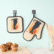 This oven mitt and pot holder set features a black cat decorated with Zentangle lines, with an orange sun behind it, and superimposed on a keyhole shape with random orange chips. An unusual design, reminiscent of Aubrey Beardsley's work, and perfect for anyone who loves cats.