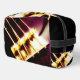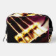 The original abstract photograph by ZoeSPEAK on this Dopp Kit with a music theme focuses on the base of an electric bass guitar, the part where the strings begin and rise all the way up to the neck. The closeup photo coloration is done in rich, deep warm browns with a golden light on the metal plate, strings, screws and springs.