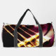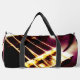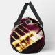 The original abstract photograph by ZoeSPEAK on this Duffel Bag with a music theme focuses on the base of an electric bass guitar, the part where the strings begin and rise all the way up to the neck. The closeup photo coloration is done in rich, deep warm browns with a golden light on the metal plate, strings, screws and springs.