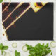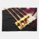 The original, abstract photograph by ZoeSPEAK on this Kitchen Towel focuses on the base of an electric bass guitar, the part where the strings begin and rise all the way up to the neck. The closeup photo coloration is done in rich, deep warm browns with a golden light on the metal plate, strings, screws and springs.
