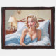 The Bed Is Just Fine AI Concept Art by Xzendor7; states the smiling blonde pin up girl as she reclines on it. Read The Short Story At My Website: https://xzendor7.com/the-bed-is-just-fine-by-xzendor7/
