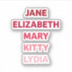 Show your bookish side and love for Jane Austen books with this bookish sticker featuring the names of the Bennet sisters in different shades of pink from Pride and Prejudice by Jane Austen: Jane, Elizabeth, Mary, Kitty and Lydia. Great for book lovers and fans of Jane Austen.