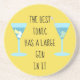 "The best tonic has a large gin in it" written on a bright yellow coaster and decorated with two cocktail glasses of gin and tonic.