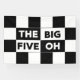 50th birthday party banner features a bold black and white checkered pattern with the words "The Big Five Oh" in alternating white on black and black on white text.