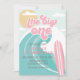 The Big One! Surfing Beach Birthday invite with turquoise waves and pink surf board.
