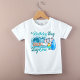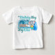 The big one 1st birthday surfing retro beach party personalised t-shirt with a baby surfer elephant and a surfboard big wave at the background.