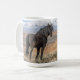 The black stallion, Mesquite, pauses above the colourful red point section of McCullough Peaks HMA.