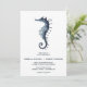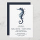 Nautical chic wedding invitation features a vintage style hand drawn seahorse watercolor illustration in navy blue.