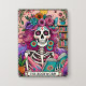 Vibrant, colourful design featuring a funny tarot card with a female skeleton. The skeleton has wild pink hair with flowers in it, a sugar skull face, and is holding a open book. The colourful text reads: "The bookworm". This design is available on a wide variety of products.