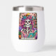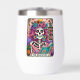 Vibrant, colourful design featuring a funny tarot card with a female skeleton. The skeleton has wild pink hair with flowers in it, a sugar skull face, and is holding an open book. The colourful text reads: "The bookworm". This design is available on a wide variety of products.