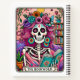 Vibrant, colourful design featuring a funny tarot card with a female skeleton. The skeleton has wild pink hair with flowers in it, a sugar skull face, and is holding a open book. The colourful text reads: "The bookworm". This design is available on a wide variety of products.