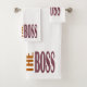 Bath towel set with funny and bold text design in brown .Great gift for not only your boss at the office but for any wanna be bosses ,bossy persons in your life .Design by Alma Wad .