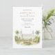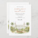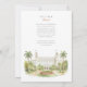 Invite your guests to a truly memorable occasion with this exquisite watercolor wedding invitation, showcasing the iconic Breakers Hotel in Palm Beach, Florida. The artwork beautifully captures the grandeur of the historic, white and cream-coloured luxury resort, complete with its signature twin towers proudly flying American flags. Rendered in a soft, elegant watercolor style, the scene is framed by lush tropical landscaping featuring tall, graceful green palm trees. A vibrant circular flower bed at the forefront displays beautiful blooms in radiant shades of red and soft pink, possibly roses or classic garden annuals, complemented by rich green foliage and meticulously manicured lawns. This invitation exudes sophistication and is perfect for a luxurious destination wedding or a classic Florida celebration. The front elegantly presents your wedding details, while the reverse side offers "The Finer Details" for additional guest information. The colour palette includes crisp whites, warm creams, various verdant greens of the palm trees and lawns, vibrant reds and pinks of the flowers, and subtle sandy tones of the pathways.