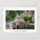 Postcard of the bridge over Bybrook River in the small, quaint village of Castle Combe with houses built out of honey-coloured stone in the Cotswolds, England, UK with a white border and the text: 'Cotswolds'.