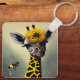 Cute keychain features AI generated surreal painting of a whimsical giraffe morphed with a bumblebee.