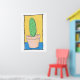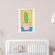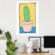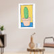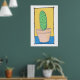This poster has a simple composition, hand drawn using pens and watercolour, of a single lobed cactus in a flower pot. The background is yellow and blue, the pot is pinky beige and the cactus is very green and spiky, all contained within a thin black border, with a white surround. It's a charming example of simple, modern art.