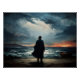 Before a restless sea and a dramatic sky, a solitary figure gazes at the unknown. The twilight glow suggests hope, while the boat on the shore invites a journey.