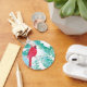 This image is designed with a red cardinal sitting on a snow covered branch of a pine tree. The cardinal is sitting and watching as snow flakes fall from the sky. The ground is covered with snow. This keychain will be a great piece to own or to give as a gift.