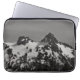 A black and white photograph of two peaks in the Tatoosh Range known as The Castle and The Pinnacle. The mountain range is covered in snow despite it being summer. There are trees and stone scattered about the landscape and mountains. The sun's position allows for shadows to be cast on the mountain. Incognito clouds grace the sky. Image Copyright ©2023 Kimberly J Tilley. zazzle.com/store/developingnature
