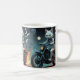 A Cat dressed in all white like a ghost driving a motorcycle through a spooky haunted town full of skeleton heads and ominous clouds.