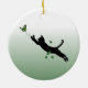 A black cat with green eyes jumping in the air trying to catch a beautiful green butterfly.