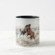 This design features a painting by the American artist Charles M. Russell (1864–1926). It shows two wild horses challenging each other for dominance. The stallions are rearing up as they attempt to attack each other. One of the horses has a dark brown or black coat, while the other horse has a chestnut brown coat. The two horses are fighting in the American Old West, where the desert landscape is dusty and dry. There are many other horses in the backgrounds, including some young foals, further away from the fighting stallions. The original art was painted in 1898.